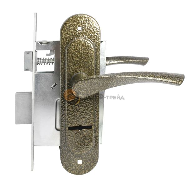 Замок врезной с ручками. Предназначен для установки в деревянные двери толщиной до 65 мм, правого и левого открывания. Стальной оцинкованный корпус, засов с вылетом 22мм. Межосевое расстояние 55мм. Удаление ключевого отверстия 55мм. Габаритный размер 130х85 мм. Ручки - сталь, алюминиевый сплав, покрытие - полимерная краска, крепление - стяжками. Сувальдный механизм запирания, 3 ключа в комплекте.