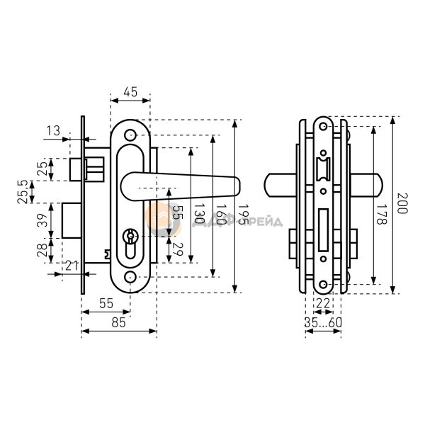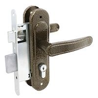 Замок врезной с ручками, цилиндровый. Предназначен для установки в деревянные двери толщиной 40-50мм, правого и левого открывания. Стальной оцинкованный корпус. Прямоугольный ригель из цинкового сплава, вылет 22мм. Межосевое расстояние 55мм. Удаление ключевого отверстия 55мм. Габаритный размер 85х130 мм. Ручки - сталь, алюминиевый сплав, покрытие - краска, крепление - стяжками. Комплектуется цилиндровым механизмом 70мм с 4 ключами. 15000 секретных комбинаций.