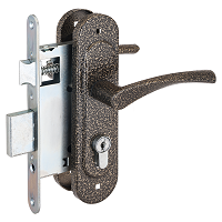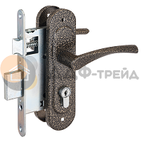 Замок врезной с ручками, цилиндровый. Предназначен для установки в деревянные двери толщиной 40-50мм, правого и левого открывания. Стальной оцинкованный корпус. Прямоугольный ригель из цинкового сплава, вылет 22мм. Межосевое расстояние 55мм. Удаление ключевого отверстия 55мм. Габаритный размер 85х130 мм. Ручки - сталь, алюминиевый сплав, покрытие - краска, крепление - стяжками. Комплектуется цилиндровым механизмом 70мм с 4 ключами. 15000 секретных комбинаций.