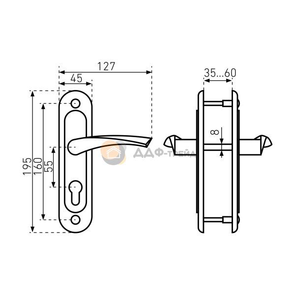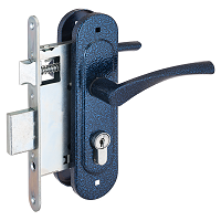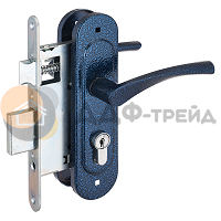 Замок врезной с ручками, цилиндровый. Предназначен для установки в деревянные двери толщиной 40-50мм, правого и левого открывания. Стальной оцинкованный корпус. Прямоугольный ригель из цинкового сплава, вылет 22мм. Межосевое расстояние 55мм. Удаление ключевого отверстия 55мм. Габаритный размер 85х130 мм. Ручки - сталь, алюминиевый сплав, покрытие - краска, крепление - стяжками. Комплектуется цилиндровым механизмом 70мм с 4 ключами. 15000 секретных комбинаций.
