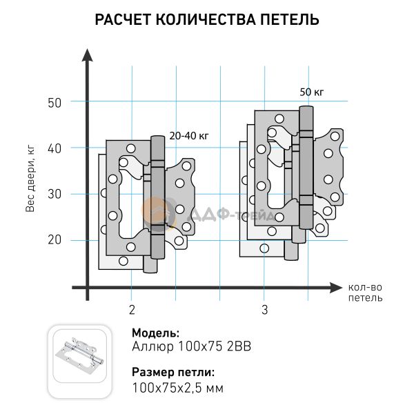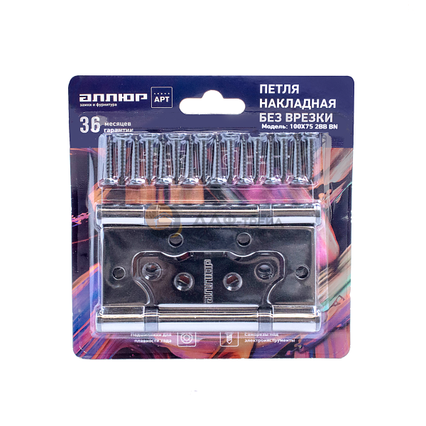 Петля дверная универсальная, без врезки. Предназначена для установки на левые и правые двери. Материал - сталь, гальваническое покрытие. Размер петли - 100х75х2,5 мм. 2 подшипника, плоский колпачок.