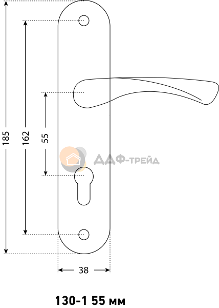 Ручка на планке под замок и цилиндровый механизм. Материал - алюминиевый сплав, гальваническое покрытие. Межосевое расстояние - 55 мм, размеры планки - 38х185 мм, длина ручки - 120 мм. В комплект входят винтовые стяжки и квадратный штырь (8х8 мм) 105 мм. Для дверей толщиной 35-45мм.
