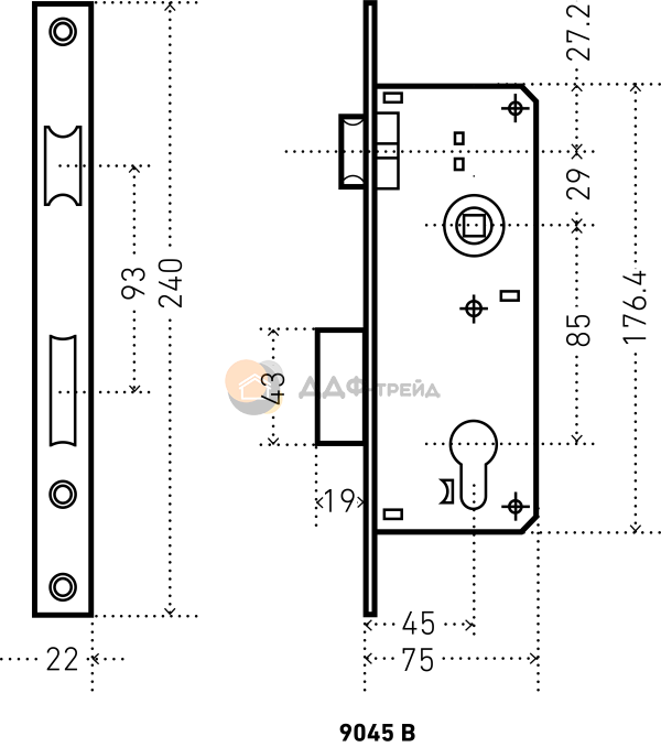 Замок врезной цилиндровый, без механизма секрета. Предназначен для установки в деревянные двери. Прямоугольный ригель, вылет 20мм. Удаление ключевого отверстия 45мм. Межосевое расстояние 85мм. Цвет торцевой планки - хром, ширина 22мм.
