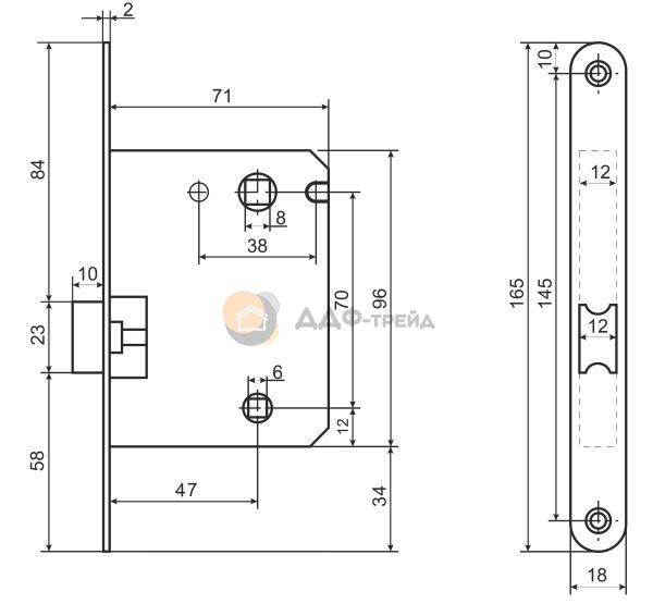 Универсальная защёлка врезная для установки на деревянные межкомнатные двери. Материал - сталь, гальваническое покрытие.Под ручку с квадратом 8 мм и сантехническую завертку с квадратом 6 мм. Удаление ключевого отверстия - 47 мм. Межосевое расстояние - 70 мм. Овальная торцевая планка для возможности установки с помощью автоматического инструмента. Ширина планки - 18мм. Габариты корпуса - 96х71х12 мм. В комплекте - защелка, саморезы, ответная планка и белый пластиковый вкладыш к ней.