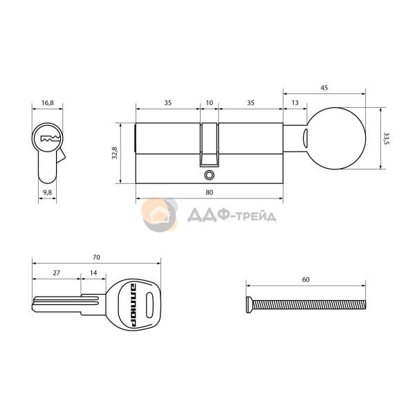 Механизм цилиндровый для врезных замков с 7 пинами секретности. Европрофиль. Перфо-ключ. Материал корпуса – латунь. Ключ-латунный, с эргономичной пластиковой головкой. Ключ-вертушка. Длина механизма - 80 мм (35х10х35). 45000 секретных комбинаций ключа. Механизм защищен от высверливания, вскрытия бампингом и отмычками. Выступающий на 30 градусов из плоскости механизма кулачок защищает цилиндр от выбивания из двери.