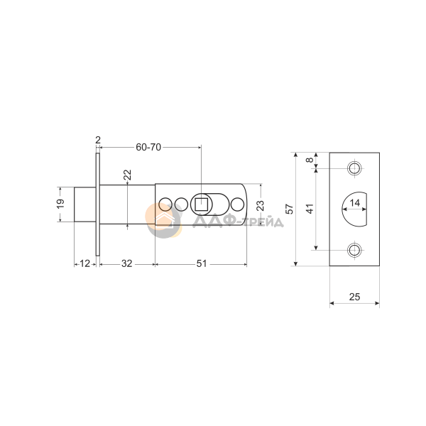 Корпус для защелок Аллюр серий 5560, 5562, 5564. Скругленный ригель размерами 19х14 мм, с вылетом 12 мм. Габариты корпуса - 83х23х20 мм.