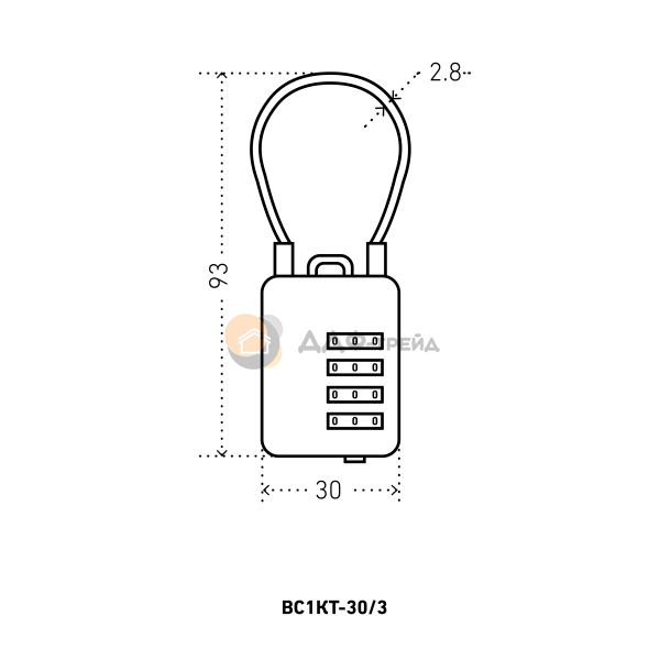 Замок кодовый с тросиком. Предназначен для защиты от несанкционированного вскрытия сумок, чемоданов и др. багажа. Замок запирается тросиком в оплетке (d=3 мм). Габариты замка - 93х30х10 мм. Диапазон цифр в каждом значении - от 0 до 9. Материал корпуса - цинковый сплав, троса - сталь, пластиковая оплётка.