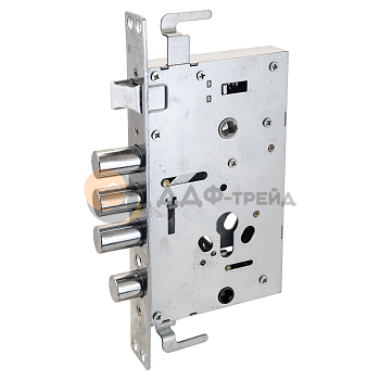 Замок врезной цилиндровый с защелкой и задвижкой, без механизма секрета. Предназначен для установки в левые китайские металлические двери, в качестве основного замка. Замок закрывается снаружи автоматически, поднятием ручки вверх. Три цилиндрических стальных ригеля, диаметр - 18мм. Вылет ригелей - 27,7 мм. 3 точки запирания. Корпус замка - сталь, толщиной 1,1мм. Удаление ключевого отверстия 60мм. Межосевое расстояние 68мм. Расстояние от центра механизма секрета до задвижки 52мм. Цвет торцевой планки - хром, ширина 30мм.