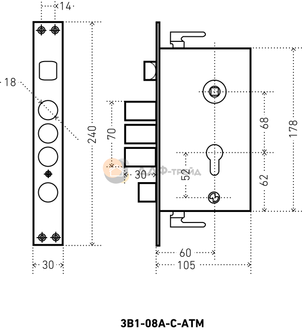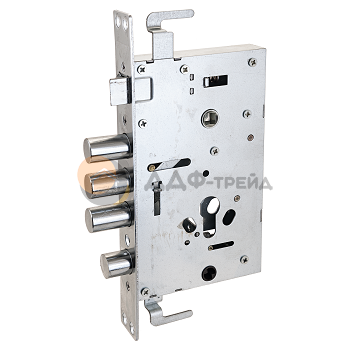 Замок врезной цилиндровый с защелкой и задвижкой, без механизма секрета. Предназначен для установки в правые китайские металлические двери, в качестве основного замка. Замок закрывается снаружи автоматически, поднятием ручки вверх. Три цилиндрических стальных ригеля, диаметр - 18мм. Вылет ригелей - 27,7 мм. 3 точки запирания. Корпус замка - сталь, толщиной 1,1мм. Удаление ключевого отверстия 60мм. Межосевое расстояние 68мм. Расстояние от центра механизма секрета до задвижки 52мм. Цвет торцевой планки - хром, ширина 30мм.