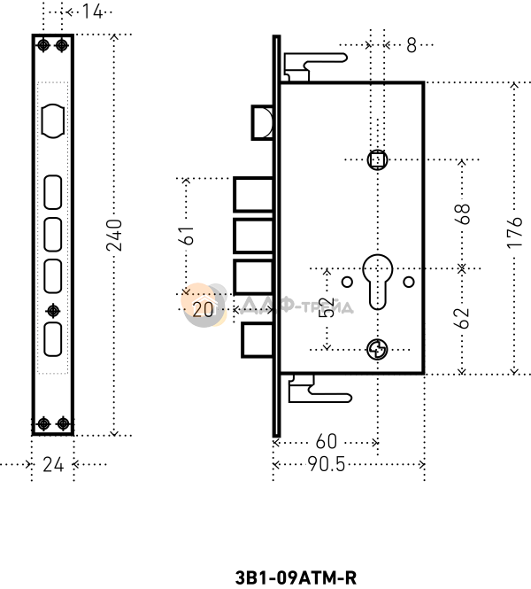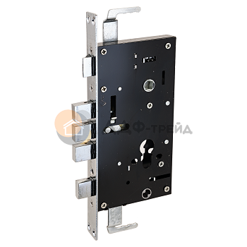 Замок врезной цилиндровый с защелкой и задвижкой, без механизма секрета. Предназначен для установки в правые китайские металлические двери, в качестве основного замка. Замок закрывается снаружи автоматически, поднятием ручки вверх. Три прямоугольных стальных ригеля. Вылет ригелей 20мм. 3 точки запирания. Корпус замка - сталь, толщиной 1,1мм. Удаление ключевого отверстия 60мм. Межосевое расстояние 68мм. Расстояние от центра механизма секрета до задвижки 52мм. Цвет торцевой планки - хром, ширина 24мм.