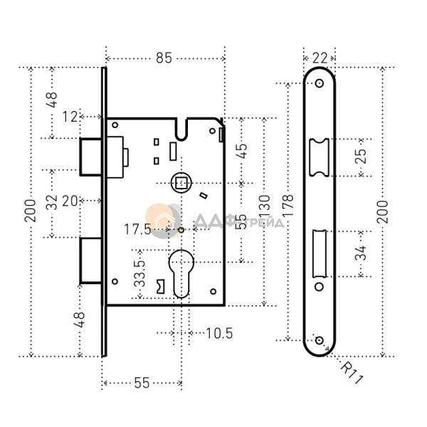 Замок врезной с комплектом ручек на планке. Предназначен для установки в деревянные двери толщиной 35 - 40 мм, правого и левого открывания. Материал ручки - алюминиевый сплав. Материал планки - сталь. Покрытие комплекта ручек: гальваническое, многослойное. Стальной оцинкованный корпус. Межосевое расстояние - 55 мм, бэксет - 55 мм. Комплектация: цинковый механизм длиной 60 мм, секретность - 4500 комбинаций, 5 английских ключей, ответная планка, квадрат 8х8 мм, винтовые стяжки, саморезы. Класс замка по ГОСТ - 1. Гарантийный срок - 3 года.