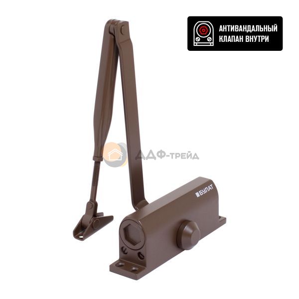 Дверные доводчики «БУЛАТ», предназначены для плавного, автоматического закрытия двери. Подходит для большинства пластиковых, деревянных и металлических дверей. Устанавливаются в квартирах, офисах, промышленных и других помещениях. Функции: регулируемая скорость закрывания двери, регулируемая скорость окончательной доводки, АНТИВАНДАЛЬНЫЙ КЛАПАН. Модель подходит для дверей весом до 140 кг. Температурный режим работы от -42 до +50 градусов. Комплект поставки Дверной доводчик Рычаг с винтовым соединением колена Крепеж Инструкция по монтажу и эксплуатации, совмещенная с паспортом изделия Шаблон для установки.