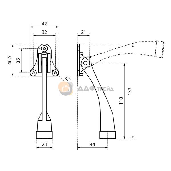 Фиксатор открывания двери "козья ножка" для коммерческих и общественных помещений. Позволяет заблокировать дверь в любом открытом положении путем опускания фиксатора. Подходит для любых типов дверей, устойчив на любых покрытиях - бетон, ламинат, плитка и пр. Усиленная пружина для крепкой фиксации в поднятом положении.