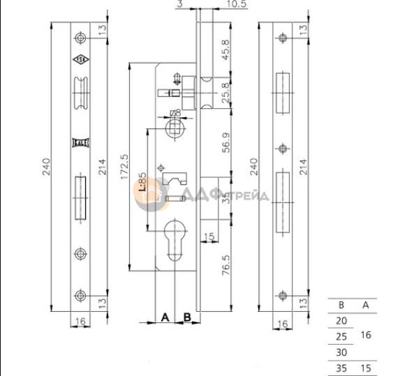 Корпус узкопрофильного замка с защёлкой 153/P (25 mm) w/b (хром) Тип упаковки:Коробка, Количество комбинаций:-, Класс безопасности:2, Тип механизма секретности:Цилиндровый, Бэксет (удаление ключевого отверстия):25 мм, Тип замка:С защелкой под ручку, Материал цилиндра:-, Ширина планки:16 мм, Цвет планки:Никель, Комплектация цилиндром:Нет, Тип ригеля:Прямоугольный, Межосевое расстояние:85 мм, Количество ключей:-, Производитель: Kale Kilit