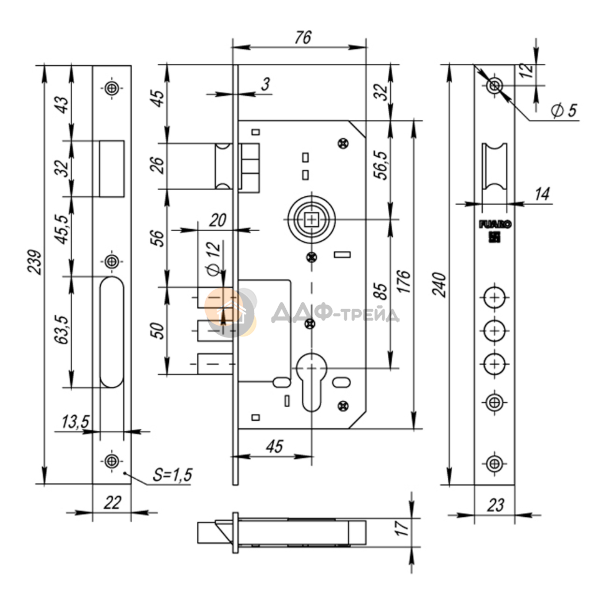 Корпус врезного цилиндрового замка Fuaro 900-3MR W/B с тремя ригелями. Подходит для установки на деревянные входные и межкомнатные двери. Универсальная защелка, для левых и правых дверей. Вылет ригеля: 20 мм. Межосевое расстояние: 85 мм. Бэксет: 45 мм. Ширина лицевой планки: 23 мм. В комплектацию входят: ответная планка, винт для евроцилиндра 70 мм. Цвет: золото.