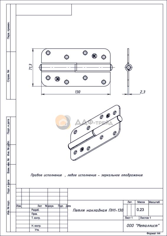 Вашему вниманию представлена надежная и недорогая левая накладная петля ПН 1-130. Завод «Металлист» предлагает продукцию собственного производства, мы занимаемся производством скобяных изделий с 1937 года и гарантируем: