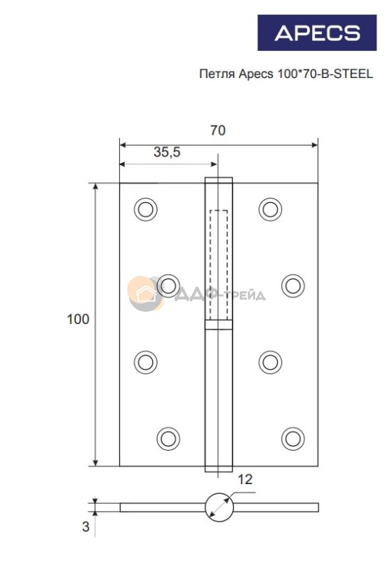 Разъемные врезные петли Apecs - одно из самых качественных предложений на рынке стальных петель. Предназначены для деревянных межкомнатных дверей. Петли Apecs прошли испытания в России и сертифицированы согласно ГОСТ 5088-2005. Укомплектованы подшипниками качения, обеспечивающими плавность хода и долгий ресурс службы. Закаленные саморезы позволяют использовать электроинструмент при установке. Рекомендации по установке петель в зависимости от веса дверного полотна: - максимальный вес двери на 2 петли: 100*70-B - 40 кг, 120*80-B - 50 кг; - максимальный вес двери на 3 петли: 100*70-B - 50 кг, 120*80-B - 70 кг.