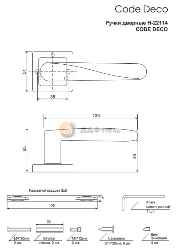 Code Deco серия 22 - коллекция дверных алюминиевых ручек и фурнитуры на квадратном основании. Рекомендованная толщина двери: 30 - 60 мм. Для установки на входные и сантехнические двери комплектуются накладками и фиксаторами WC аналогичной серии.