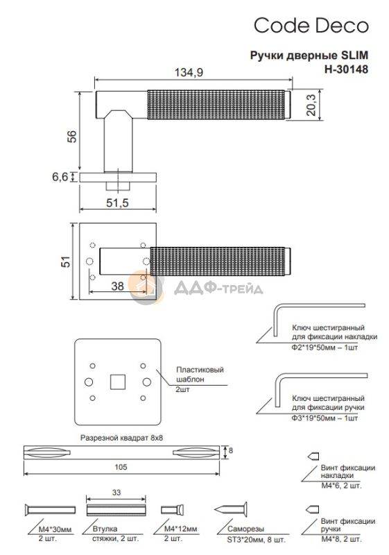 Ручки Code Deco 30 серия Slim - алюминиевые ручки на тонком квадратном основании для межкомнатных дверей. Рекомендованная толщина двери: 30 - 60 мм. Для установки на входные и сантехнические двери комплектуются накладками и фиксаторами WC аналогичной серии.