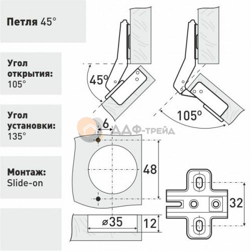- Простая установка: данная мебельная петля легко монтируется на поверхность мебели с помощью специальных крепежных элементов.