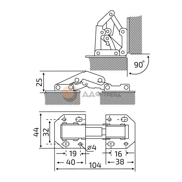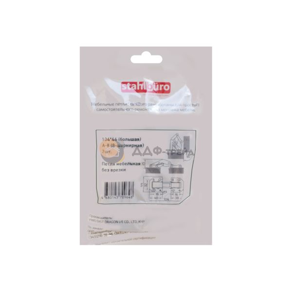 Петля 104*44 это 8-ми шарнирная одноходовая мебельная петля с пружиной, без врезки, с углом открывания в 90° и углом установки в 90°. Пружинный механизм обеспечивает плавное и мягкое открывание/закрывание фасада. В комбинации с двумя планками под саморезы (идущими в комплекте), петля 104*44 надежно устанавливается на деревянные фасады. Модель обладает упрощенным методом монтажа на саморезы и не требует врезки.