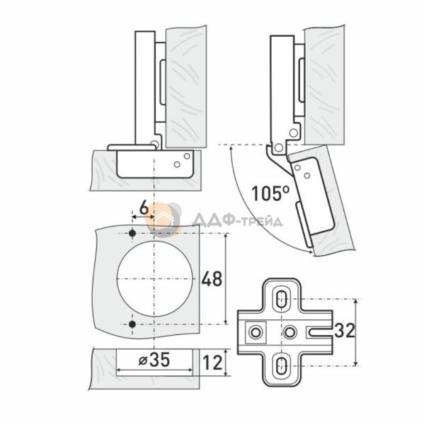 Петля 362A это накладная мебельная петля, с углом открывания 105° и углом установки 90°. Она обеспечивает открывание/закрывание фасада. В комбинации с планкой под саморезы (идущей в комплекте), петля 362A надежно устанавливается на деревянные фасады. Модель обладает методом монтажа Slide-on: для фиксации достаточно открутить винт, соединяющий две части петли.