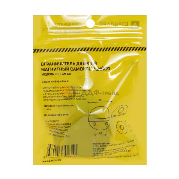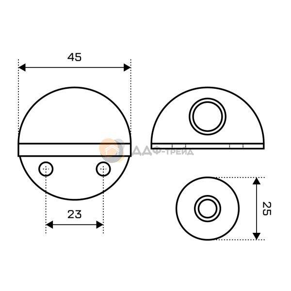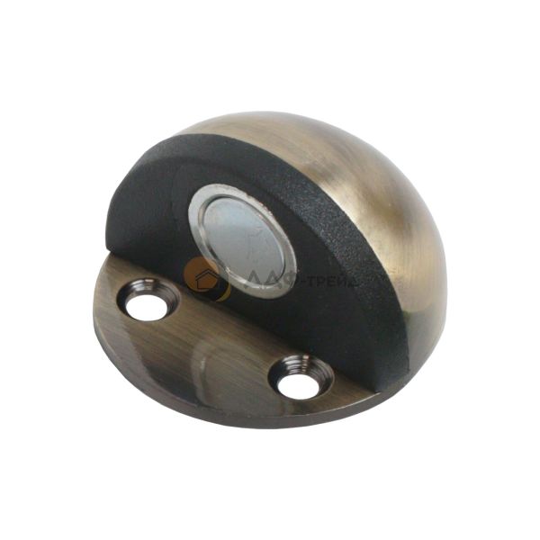 Ограничитель/упор дверной напольный магнитный. Материал - сплав ЦАМ, гальваническое покрытие. Имеет форму полусферы. Диаметр основания - 45мм. Отличительной особенностью является возможность крепления как на двойной скотч 3М, без сверления отверстий в полу, так и на саморезы с дюбелями.