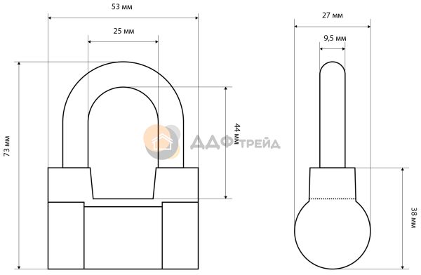 Замок навесной дисковый общего применения. Материал корпуса - алюминиевый сплав. Стальная дужка диаметром 9 мм; проем дужки - 44 мм по высоте и 25 мм по ширине. Габариты корпуса - 53х38 мм.Комплектуется 3 ключами. Ключевое отверстие расположено сбоку замка.