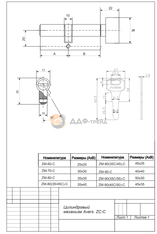 Цилиндровые механизмы Avers ZC - бюджетные цилиндры из ЦАМа, предназначенные для комплектации замков под евроцилиндр 1 класса. Рекомендуются для установки в межкомнатные и входные двери. Во входные двери устанавливаются с другими товарами (приобретаются отдельно): - защитная накладка Avers DP-80-C; - защитная накладка Avers Pro 50/11 совместно с установочными пластинами Avers 50/7-DP-11 или Avers 50/8-DP-15; - защитная накладка Avers Pro 50/27. ВАЖНО: при установке цилиндров не использовать электроинструмент.
