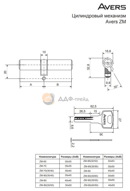 Цилиндровые механизмы Avers ZM - бюджетные цилиндры из ЦАМа, предназначенные для комплектации замков под евроцилиндр 1 класса. Рекомендуются для установки в межкомнатные и входные двери. Во входные двери устанавливаются с другими товарами (приобретаются отдельно): - защитная накладка Avers DP-80-C; - защитная накладка Avers Pro 50/11 совместно с установочными пластинами Avers 50/7-DP-11 или Avers 50/8-DP-15; - защитная накладка Avers Pro 50/27. ВАЖНО: при установке цилиндров не использовать электроинструмент.