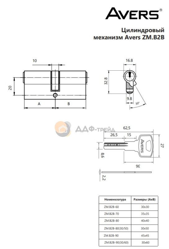 Цилиндровые механизмы Avers ZM.B2B - бюджетные цилиндры из ЦАМа, предназначенные для комплектации замков под евроцилиндр 1 класса. Рекомендуются для установки в межкомнатные и входные двери. Во входные двери устанавливаются с другими товарами (приобретаются отдельно): - защитная накладка Avers DP-80-C; - защитная накладка Avers Pro 50/11 совместно с установочными пластинами Avers 50/7-DP-11 или Avers 50/8-DP-15; - защитная накладка Avers Pro 50/27. Индекс В2В - оптимальное предложение для производственных компаний, а также для комплектации объектов, тендеров. ВАЖНО: при установке цилиндров не использовать электроинструмент.