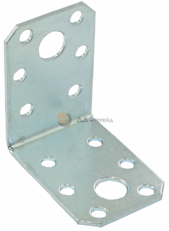 Крепежный уголок считается наиболее простым и дешевым видом перфорированного крепежа. Самое широкое применение это изделие получило для изготовления конструкций из дерева или ДСП любой сложности. Данный вид крепежа пригодится при сборке мебели, возведении стропильных систем, элементов деревянных домов и декоративных деревянных конструкций. Крепежный уголок позволяет сформировать угол равный 90 градусовусов между двумя элементами конструкции. Крепежный уголок может быть усиленным. В отличие от обычного крепежного уголка, уголок усиленный обладает ребром жесткости, что обеспечивает не только повышенный уровень надежности соединений, но и более продолжительный срок эксплуатации. При установке уголка не нужно задействовать специальное оборудование или применять врезку, а это позволяет сократить затраты на монтаж и облегчить его использование. Цинковое покрытие защищает уголок от коррозии и придает эстетичный вид.