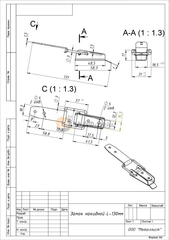 Длина предлагаемой накидной защелки для ящиков составляет 130 мм. Все детали выполнены из качественной углеродистой стали и имеют защитное антикоррозионное цинковое покрытие. Также вы можете приобрести изделия с другими видами покрытий: