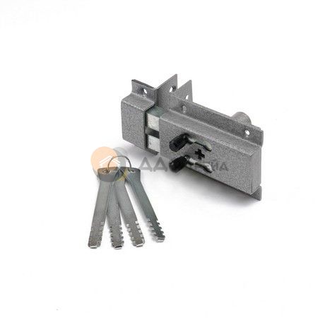 Замок накладной реечный. Предназначен для установки на различные двери. Два прямоугольных ригеля размерами 14х14 мм, с максимальным вылетом 22 мм. Удаление ключевого отверстия - 42 мм. Габариты замка - 92х68х59 мм. Комплектация - 4 ключа, запорная планка. Закрывание и открывание замка изнутри производится ручкой, снаружи ключом. Замок открывается на обратном ходе ключа, что повышает его секретозащищенность. Имеет ручную фиксацию ригелей в открытом и закрытом положениях