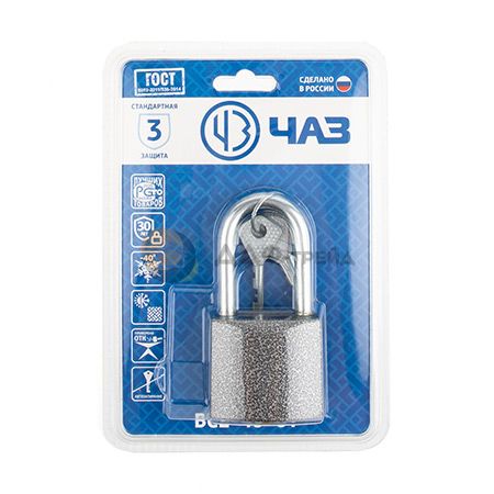 Навесной замок ЧАЗ ВС2-3А предназначен для запирания дверных блоков, ворот и других строительных конструкций с открывающимися элементами, для защиты велосипедов, скутеров, мопедов, колясок, гаражей и кузовов грузовых автомобилей, для ограничения доступа к охраняемым или опасным объектам. Изготовлен из алюминия. Замок оснащен автоматическим запиранием и дисковым типом механизма секретности с 7000 секретных комбинаций. Диаметр дужки составляет 8 мм. Изделие обладает высокой морозоустойчивостью. Размер замка — 52х29х104 мм. Вес — 258 грамм. В комплекте — 3 финских ключа.