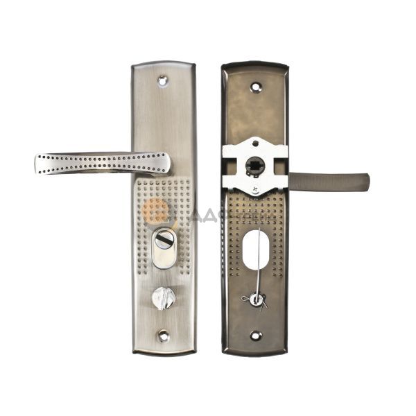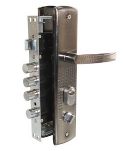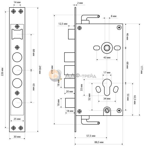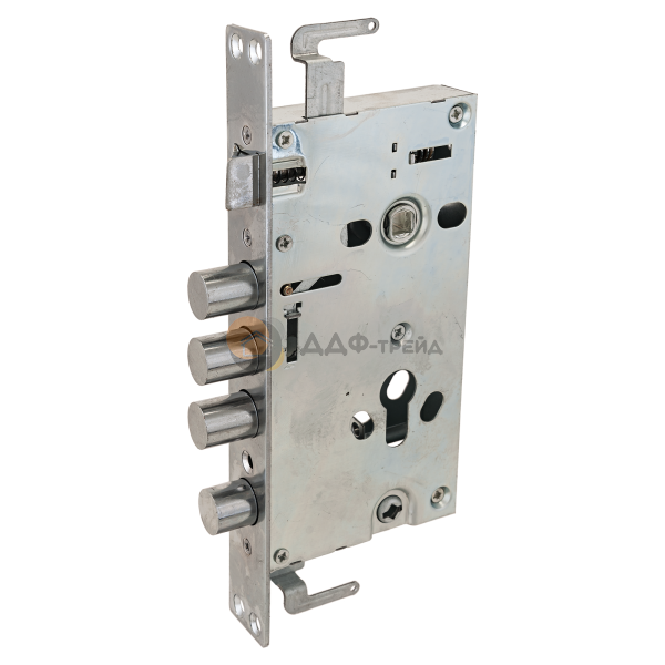 Замок врезной цилиндровый с защелкой и задвижкой, без механизма секрета. Предназначен для установки в китайские металлические двери, в качестве основного замка. Реверсивная защелка позволяет устанавливать замок на правые и левые двери. Три цилиндрических стальных ригеля. 3 точки запирания. Корпус замка - сталь, толщиной 0,9мм. Удаление ключевого отверстия 60мм. Межосевое расстояние 68мм. Расстояние от центра механизма секрета до задвижки 53мм. Ширина корпуса 88,5мм позволяет устанавливать изделие в двери с широким и узким "карманом" для замка.Цвет торцевой планки - хром, ширина 30мм.