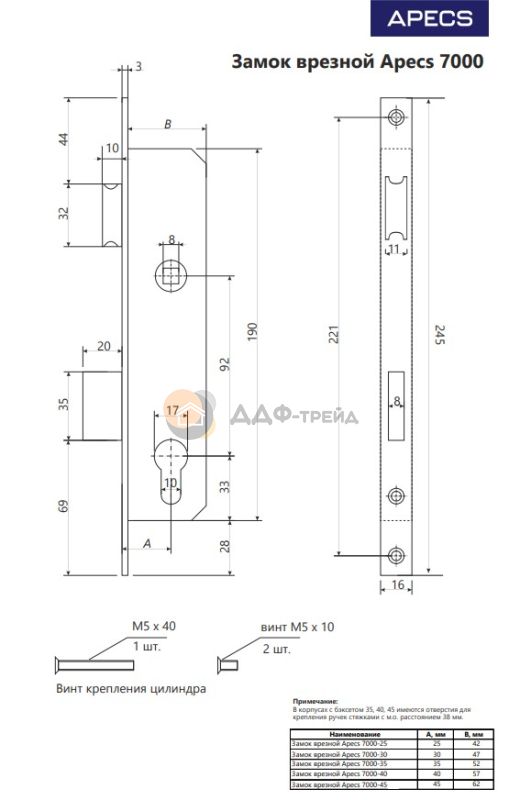 Врезные замки для дверей из ПВХ профиля. Ассортимент представлен моделями с роликовым фиксатором (индекс "R") и моделями под ручку с фалевой защелкой. Замки имеют сертификат соответствия согласно ГОСТ 5089-2011. Замки не комплектуются ответной планкой. Удаление ключевого отверстия (Backset): 25, 30, 35, 40 и 45 мм. В корпусах с Backset 35, 40, 45 мм имеются отверстия для крепления раздельных ручек стяжными винтами, посадочный размер 38 мм. Рекомендации по использованию с другими товарами (приобретаются отдельно): - механизм секретности 2 класса согласно ГОСТ и выше; - 00016666 ручки на планке Apecs HP-92.7005-W; - 00016992 ручки дверные Apecs H-0931-W; - 00016822 накладки цилиндровые Apecs DP-C-09-W; - 00017881 ручки дверные Apecs H-0903-INOX - 00017882 накладки цилиндровые Apecs DP-C-09-INOX; - 00027547 ответная планка Apecs BP-7000-ZN.