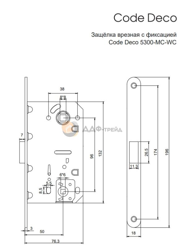 Врезная защелка Code Deco с фиксацией 5300-MC-WC предназначена для межкомнатных дверей с запиранием (евроцилиндр) или для сантехнических дверей (туалет/ванная). Пластиковый язычок со встроенным магнитом делает работу защелки максимально комфортной и бесшумной.