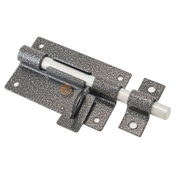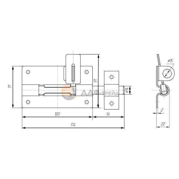 Засов накладной с проушиной для металлических дверей. Материал - сталь, полимерное покрытие. Габариты корпуса - 75х120 мм, 4 крепежных отверстия. Цилиндрический ригель диаметром 13 мм с вылетом 55 мм. В комплекте ответная планка 65х25 мм.
